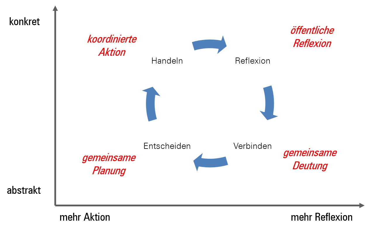Häufig werden der öffentlichen Reflexion und der gemeinsamen Deutung zu wenig Bedeutung zugemessen. Aber es sind die beiden wichtigsten Phasen im Rad des Team-Lernens. Wenn genügend Zeit darauf verwendet wird, gemeinsam nachzudenken und zu einer von allen geteilten Deutung zu gelangen, muss das koordinierte Handeln oftmals gar nicht geplant werden, weil es sich von allein ergibt. In vielen Organisationen stolpern die Teams pausenlos von einer Entscheidung und Aktion zur nächsten, ohne über frühere Versuche nachzudenken und dadurch zu lernen.
