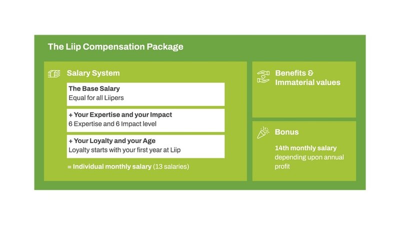 Das Lohnsystem von Liip weist viele Parallelen auf. Auch es geht von einem Basislohn aus. Dazu kommen Expertise und Wirkung sowie Firmentreue und Alter. Liip weist zusätzlich noch weitere Benefits und immaterielle Werte wie Weiterbildungsmöglichkeiten, grosszügige Familienzulagen, Entwicklungsmöglichkeiten, bessere Sozialversicherungen, verschiedene Gesundheitsangebote oder ÖV- und Velo-Subvention als Lohnbestandteile aus.