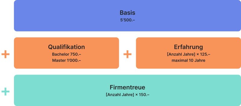 Bei smartive, einem Zürcher Unternehmen mit 27 Mitarbeiter:innen, kristallisierte sich schnell heraus: Die Lohnkalkulation soll klar, wertegetrieben, nachvollziehbar und transparent sein. Löhne sollen nicht verhandelbar sein, da dies die genannten Eigenschaften tangieren würde. Das Lohnsystem bei smartive berücksichtigt vier Komponenten: