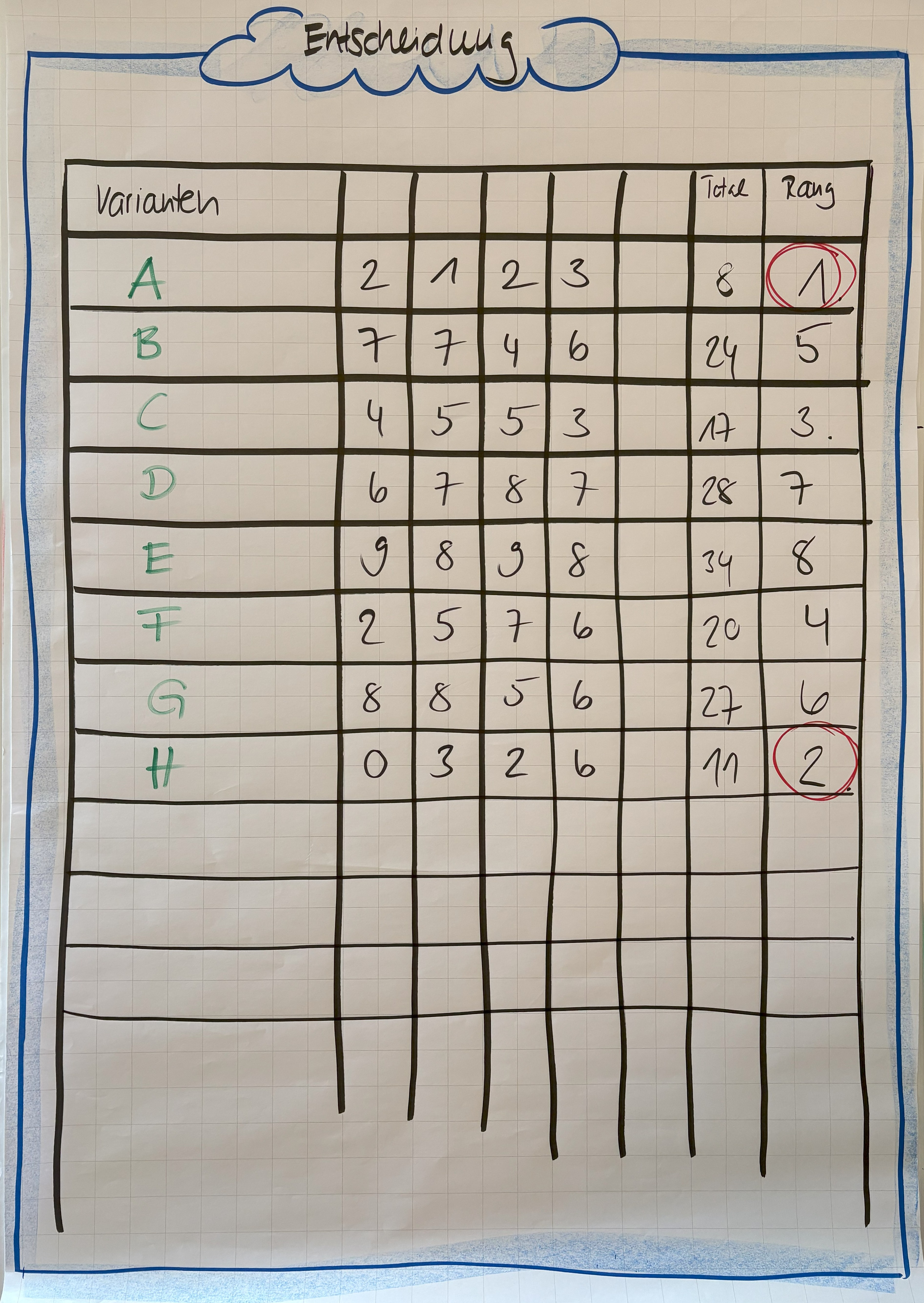 Der vermeintliche Nachteil des «technokratischen» Verfahrens hat für uns praktisch keine Bedeutung. Bei guter Vorbereitung von Seiten der Moderation erleben wir die Methode sogar als sehr effizient. Bei einem klassischen Mehrheitsentscheid erlebt man oft die Situation, dass sich einige in der Gruppe nicht für die eine oder andere Option entscheiden können. Deshalb mündet das oft in sehr lange und ermüdende Diskussion über die Vor- und die Nachteile der jeweiligen Optionen, die allerdings wenig zur Meinungsfindung beiträgt, da die Ausgangslage komplex ist oder es mehr um Machtfragen geht.