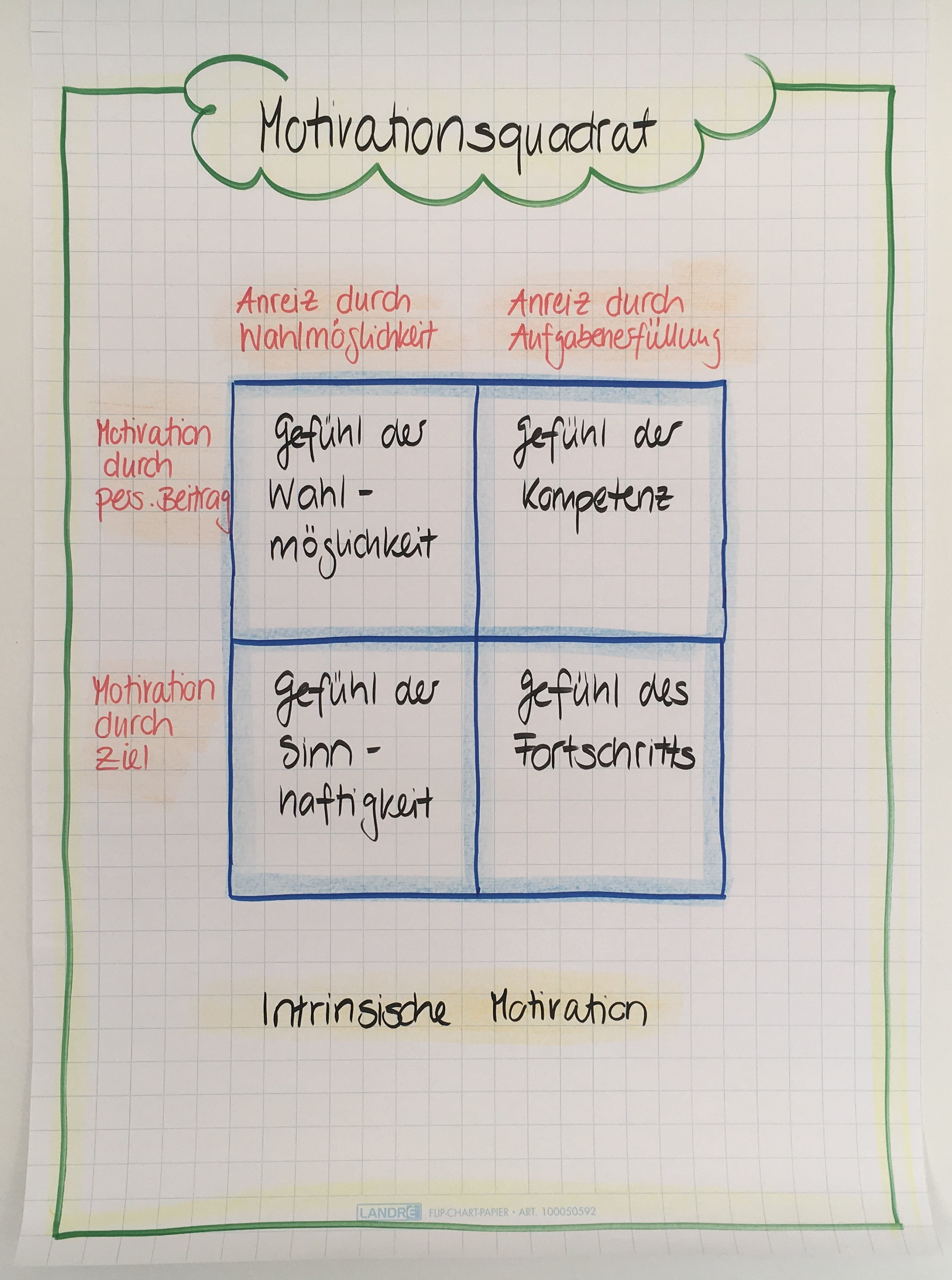 Im Workshop war es mein Ziel, den Austausch zwischen den Führungskräften über die eigene Befindlichkeit zu fördern, die Selbstreflexion anzuregen und über die Aufgabe als Führungskraft in Bezug zur Motivation zu sprechen. Im Wissen, dass das Thema Motivation sehr komplex ist, beschränkte ich mich auf die intrinsische Motivation. Um ganz konkret zu arbeiten, verwende ich gerne das Motivationsquadrat (siehe Abbildung). Anhand folgender Fragen zum Motivationsquadrat findet jeweils schnell ein Austausch statt: