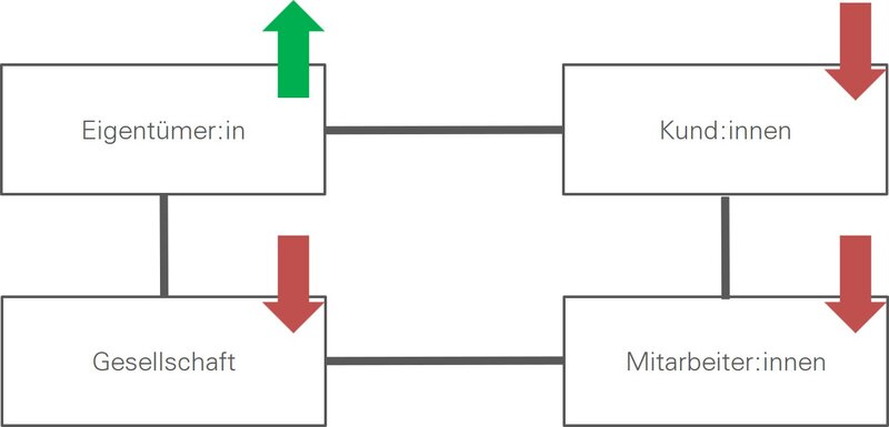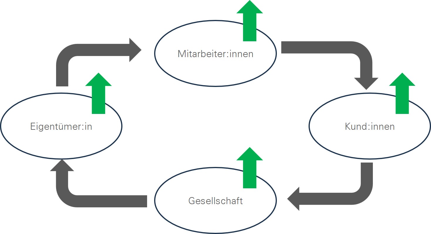 Während im ersten Wirkungskreis Erfolg lediglich als Rendite für den Eigentümer betrachtet wird, spricht der zweite Wirkungskreis nur dann von Erfolg, wenn alle vier Anspruchsgruppen «einen Gewinn» erzielen.